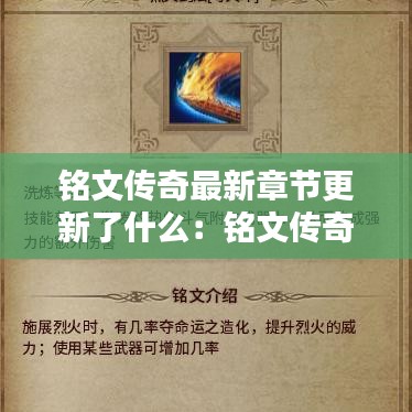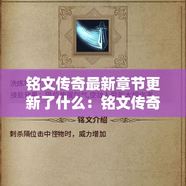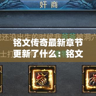铭文传奇最新章节的更新为玩家们带来了丰富的剧情和精彩的游戏体验。从角色成长到新技能的解锁,每一个细节都让玩家们感受到了游戏的魅力。随着剧情的深入,我们期待着主角们能够战胜困难,揭开世界的真相。