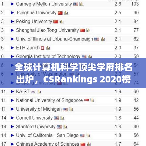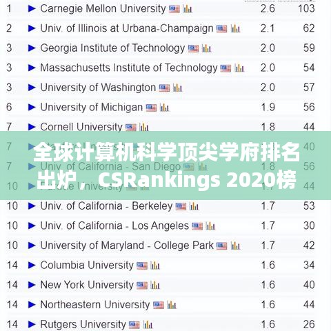 CSRankings世界排名2020为我们揭示了全球计算机科学的顶尖学府,这些学府在学术实力、科研成果、教学质量等方面表现出色,通过了解这些顶尖学府,我们可以更好地了解全球计算机科学领域的发展动态,为自己的学术发展道路提供有力支持。
